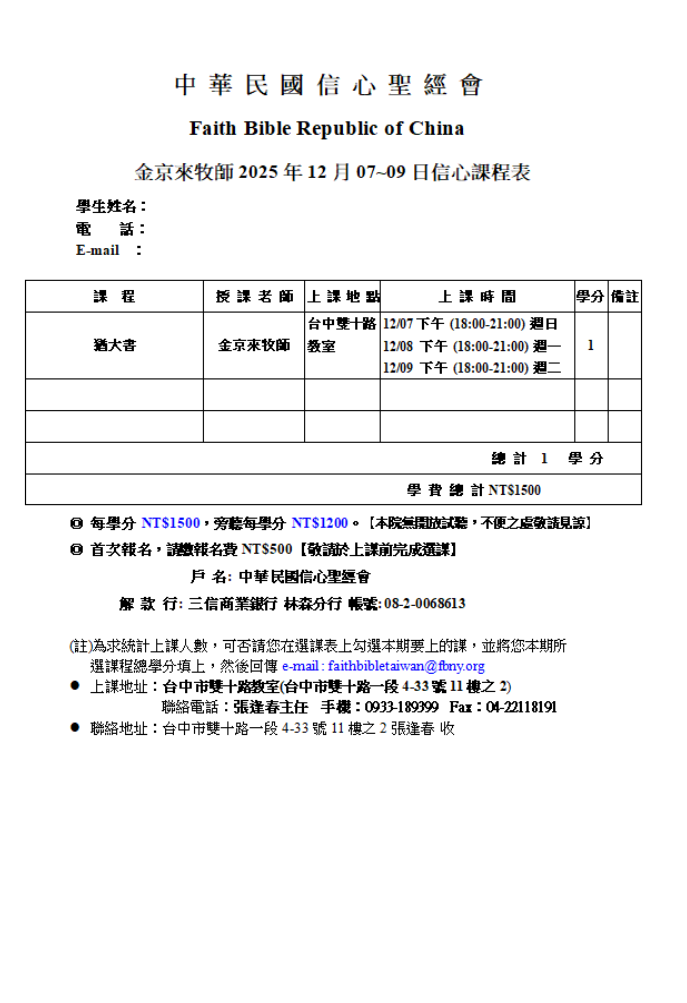郝繼華牧師2025年01月14日~2025年01月18日信心課程表